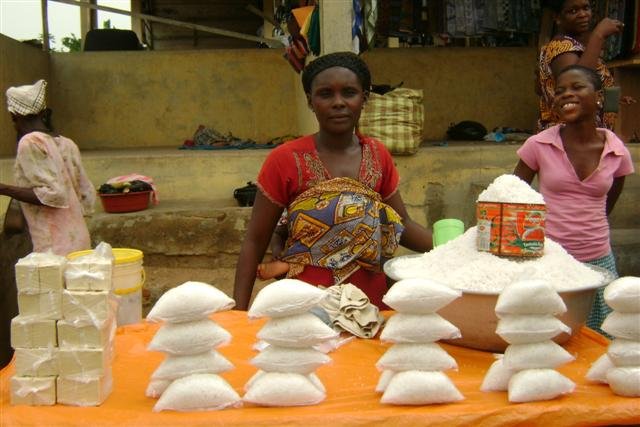 Asi Badu lives and works in Ghana and sells locally produced salt and soap at Jukwa, a local market. Asi's husband is a blacksmith and they have four children. She'll use her loan to buy more salt and soap to sell. She hopes to save the new income from her business to reinvest back into her business.